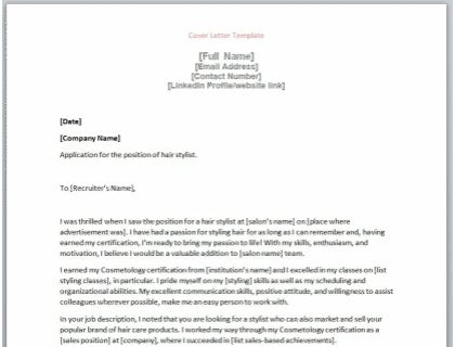 This template in Microsoft Word format can be quickly and easily adjusted for a great hair stylist cover letter.