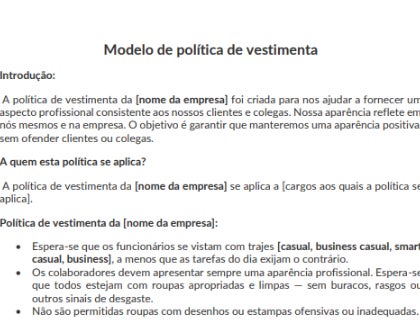 A política de vestimenta da [nome da empresa] foi criada para nos ajudar a fornecer uma aparência profissional consistente aos nossos clientes e colegas. Nossa aparência reflete em nós mesmos e na empresa. O objetivo é garantir que manteremos uma aparência positiva, sem ofender clientes ou colegas.