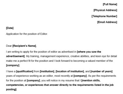 Download this template in Microsoft Word format and follow the prompts to make an engaging editor cover letter.