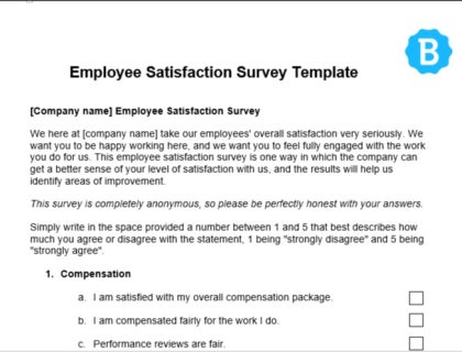 We here at [company name] take our employees' overall satisfaction very seriously. We want you to be happy working here, and we want you to feel fully engaged with the work you do for us. This employee satisfaction survey is one way in which the company can get a better sense of your level of satisfaction with us, and the results will help us identify areas of improvement.