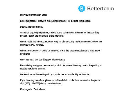 On behalf of [Company name], I would like to confirm your interview for the [Job title] position. Below are the details of the interview: