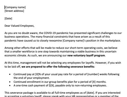 Download this Word template and customize it to issue your own call for voluntary layoffs.