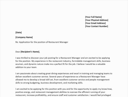 I am excited to be applying for this position with you and for the opportunity to apply my know-how, positive energy, and restaurant management abilities to oversee the efficient running of your restaurant, increase profitability, and ensure staff and customer satisfaction. I would feel privileged to be a member of your team.