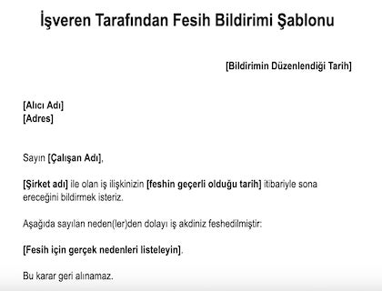 Aşağıdaki örnek fesih bildirimleri, yalnızca fikir vermek içindir. Yazılı fesih bildirimi örneği göndermeden önce hukuk müşavirinize danışın. Özellikle nedene dayalı örnek bir fesih bildirimi kullanmayı planlıyorsanız üzerinde durumunuza uygun olacak şekilde değişiklik yapılabilir.