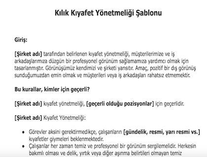 [Şirket adı] tarafından belirlenen kıyafet yönetmeliği, müşterilerimize ve iş arkadaşlarımıza düzgün bir profesyonel görünüm sağlamamıza yardımcı olmak için tasarlanmıştır. Görünüşümüz kendimizi ve şirketi yansıtır. Amaç, pozitif bir dış görünüş sunduğumuzdan emin olmak ve müşterileri veya iş arkadaşlarımızı rahatsız etmemektir.